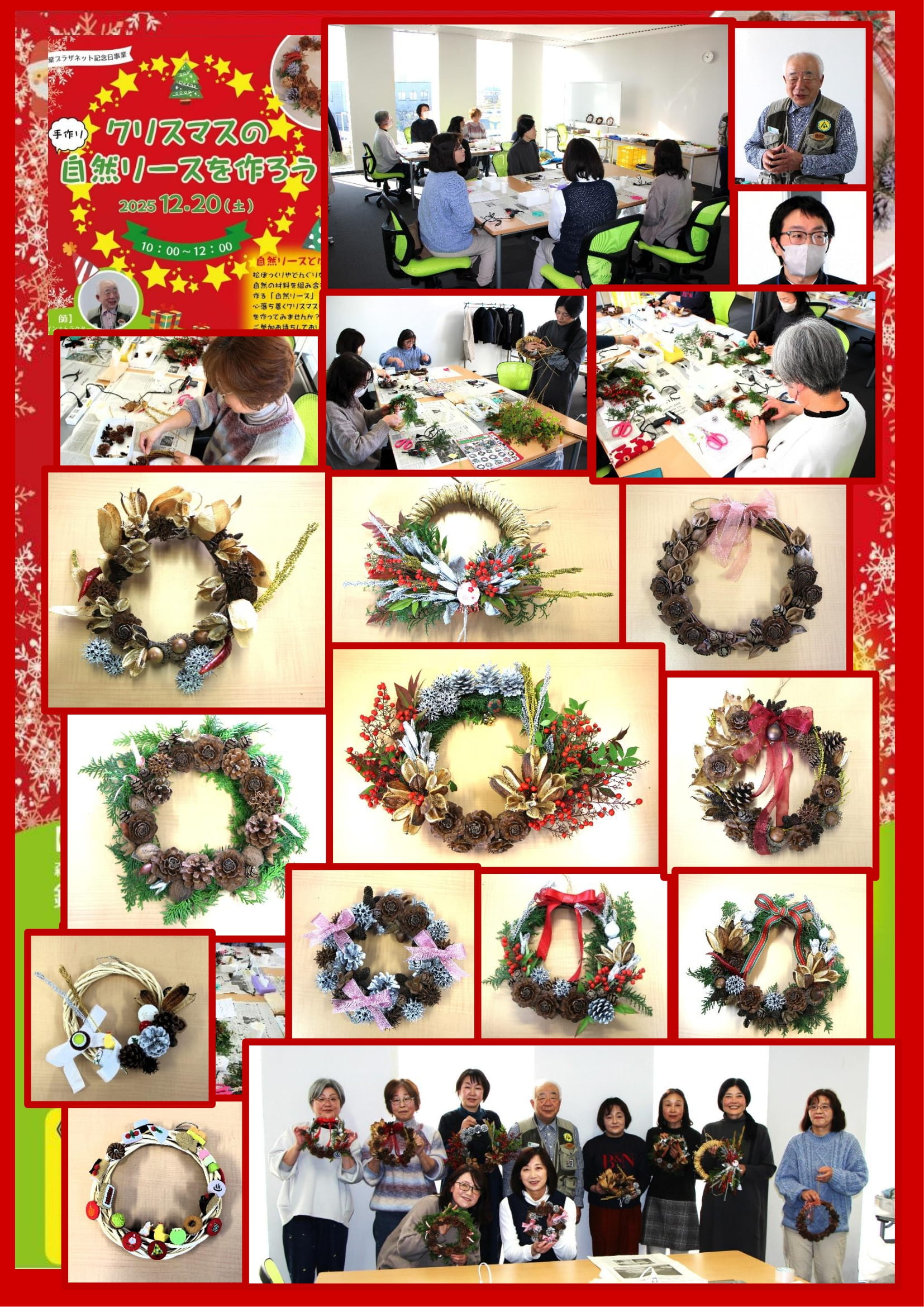 - 12月18日ワークショップ「クリスマスハンドメイド自然リースつくろう」を開催し、参加した方々には、思い思いに個性的なリースをつくりを楽しんでいただきました。